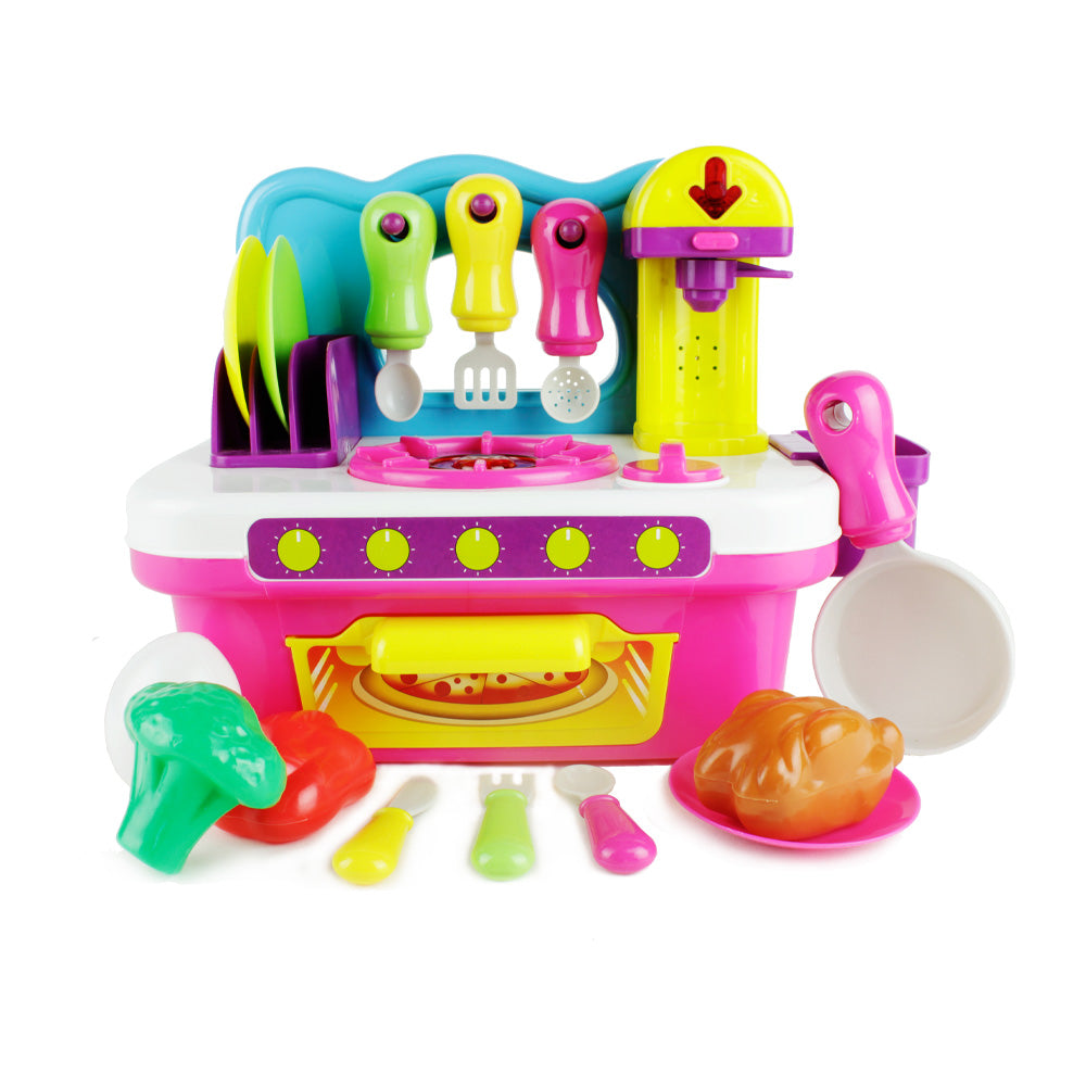 What's Inside: Set of 14 pieces, including a colorful oven, utensils, plates, and plastic food accessories