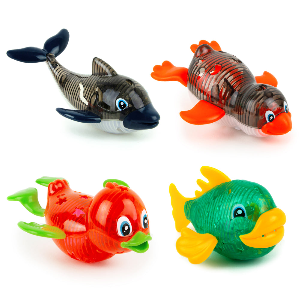Comes with 4 brightly colored water-activated light up sinking toys: a fish, dolphin, penguin, and duck!