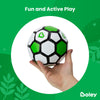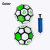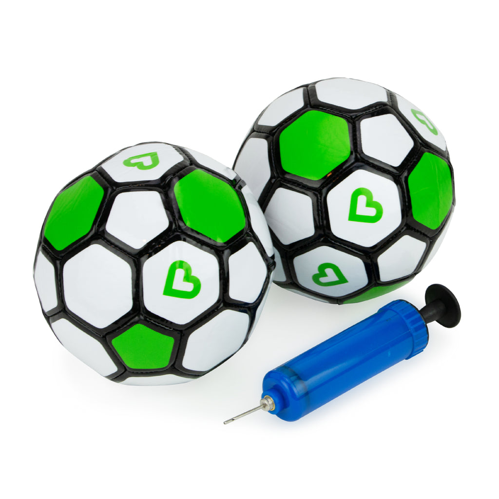 Includes 1 air pump and 2 inflatable soccer balls with a playful green and white design. Each ball is an official Size One soccer ball, measuring at 18 inches circumference and 6 inches diameter.