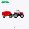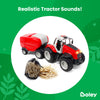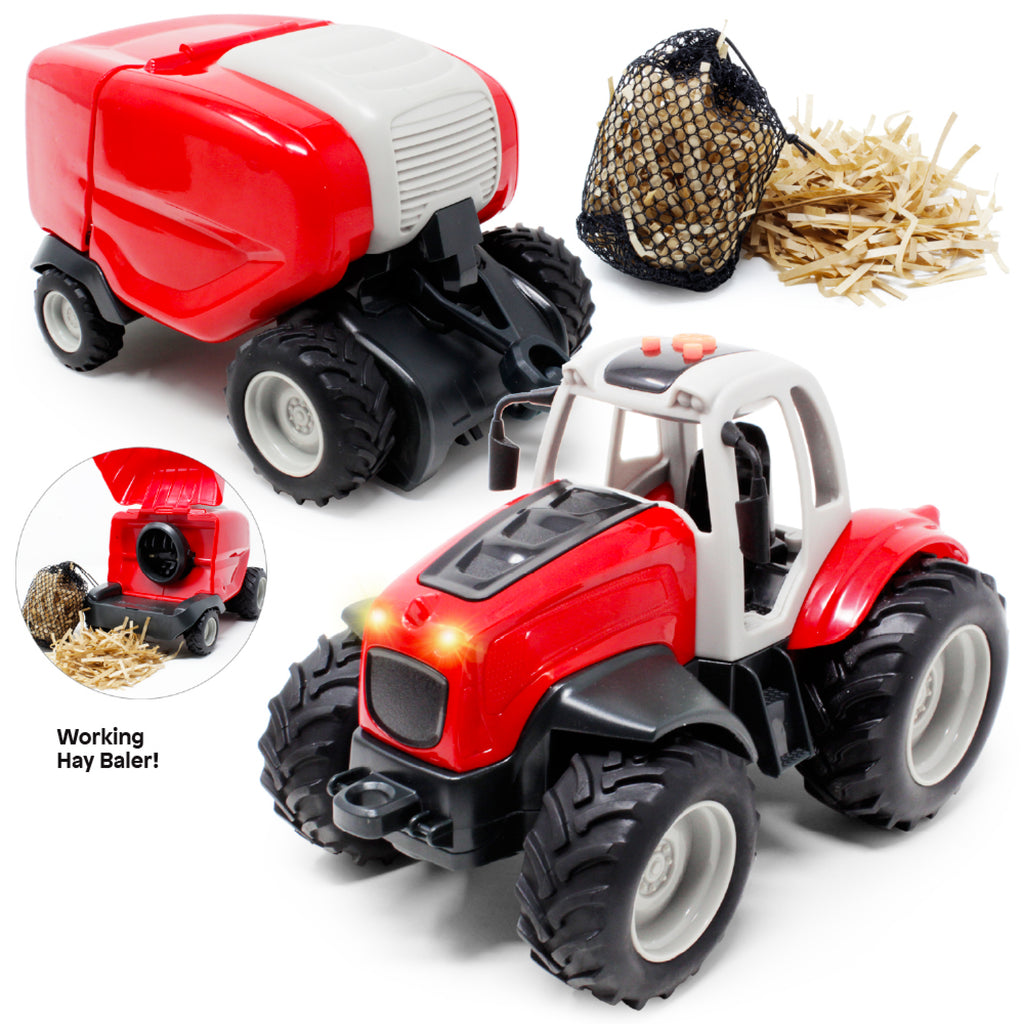 Comes with a red tractor, baler, paper hay, and 2 netted hay sacks. Features realistic tractor sounds and automatic forward drive!