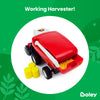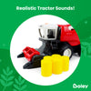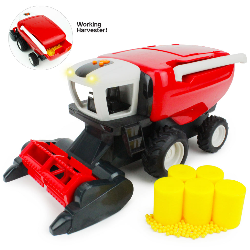 - Comes with a red harvester, small grain crops, and 5 bales of hay. Features realistic tractor sounds and automatic forward drive!