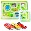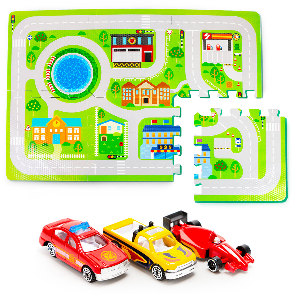 A set of colorful foam tile interlocking squares, this adorable cityscape playmat can be easily assembled whenever your child is ready for a town square adventure! Comes with 3 small toy cars to track the road, bringing the whole scene to life.