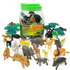 What's Inside: 40 piece set of safari animals, trees, and rocks in clear handle bucket